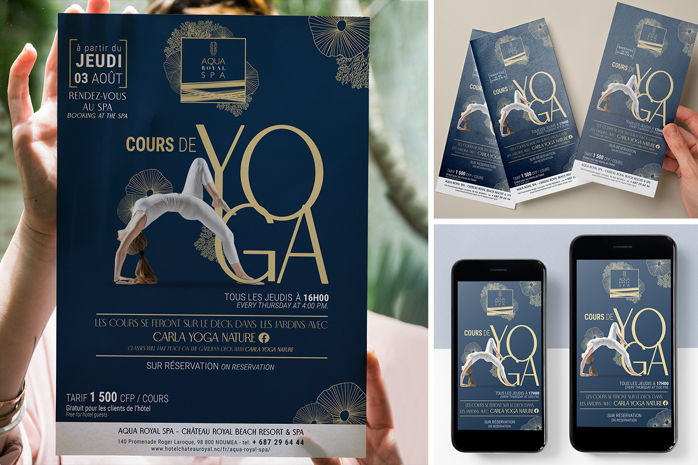Promouvoir les nouveaux cours de yoga du spa auprès d’une clientèle haut de gamme, avec une communication en accord avec l’univers raffiné et apaisant du lieu.