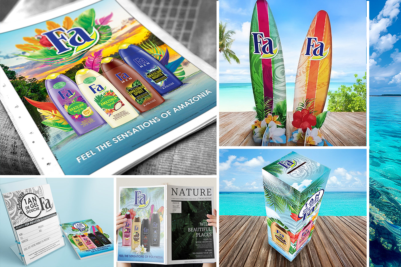 Conception d’un visuel basé sur un montage photo, de la mise en avant des trois nouveaux produits mis à la vente. Univers froid pour marquer la fraîcheur des déodorants.