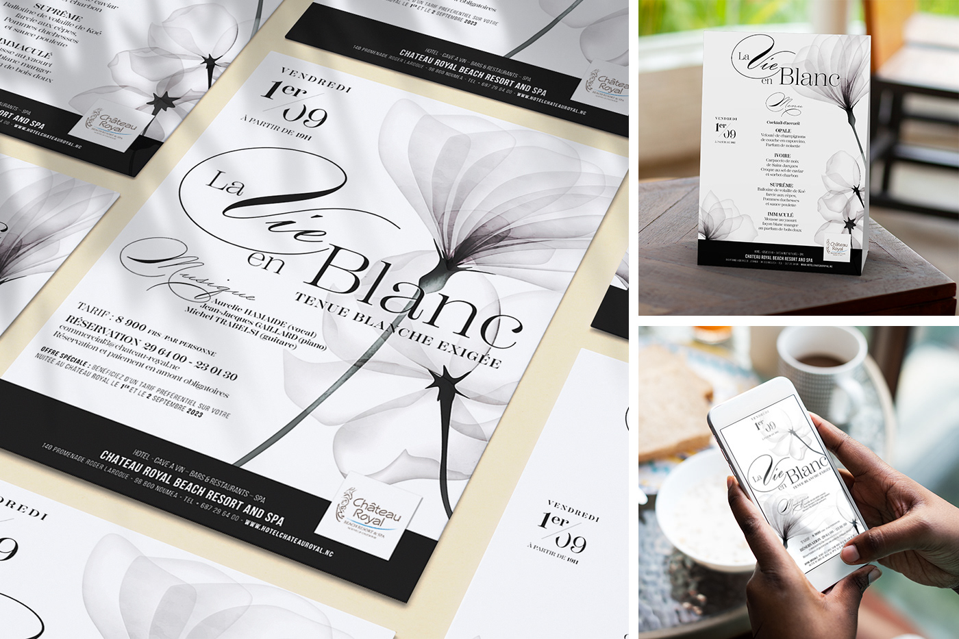 Ajout de motifs organiques rappelant la nature et déclinaison sur différents supports (print et digital) pour une communication cohérente et élégante.