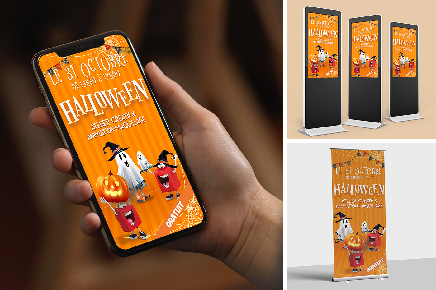 Production : Conception d’un visuel central mêlant illustrations 3D ludiques et typographie festive inspirée de l’univers Halloween.